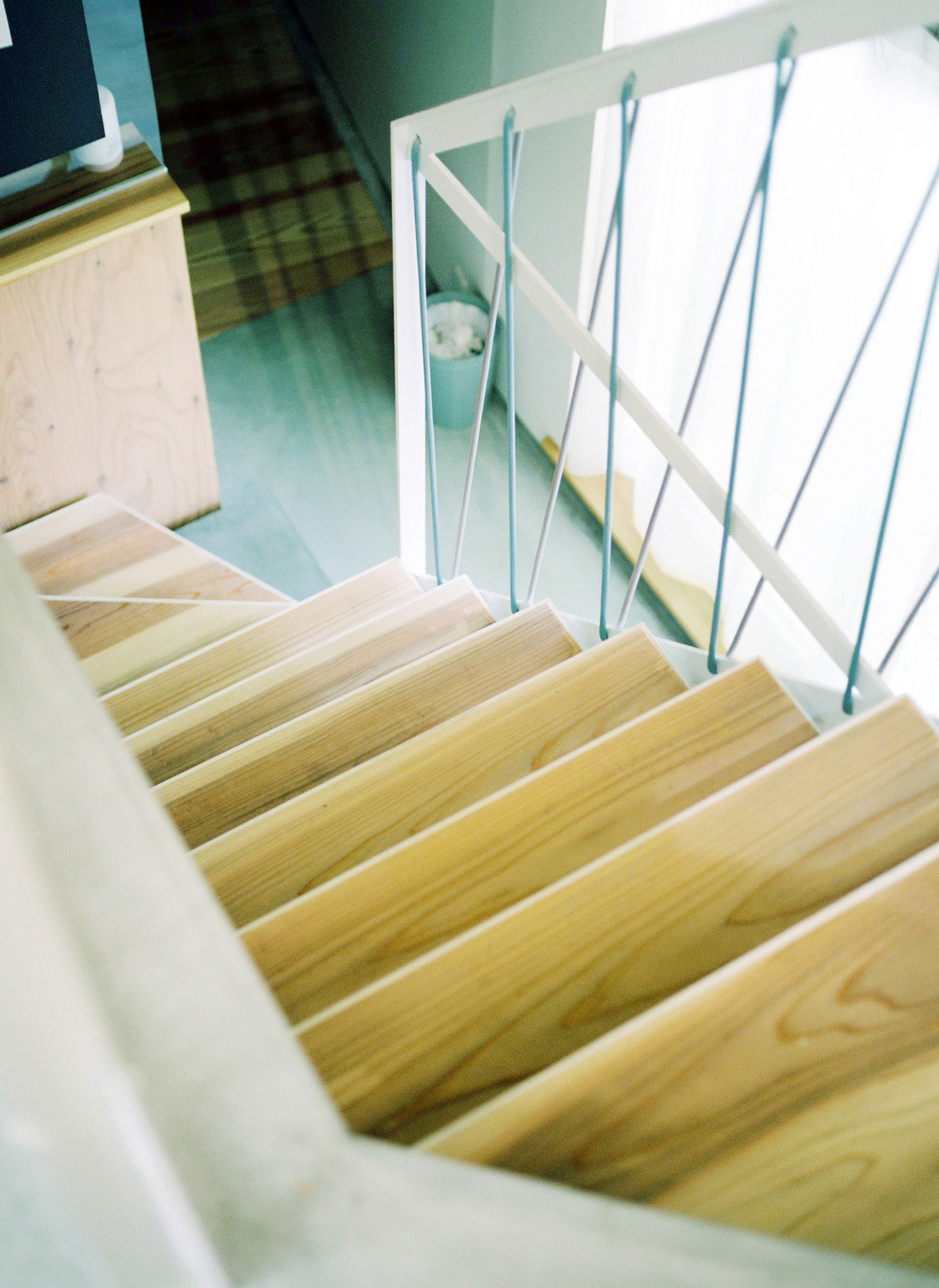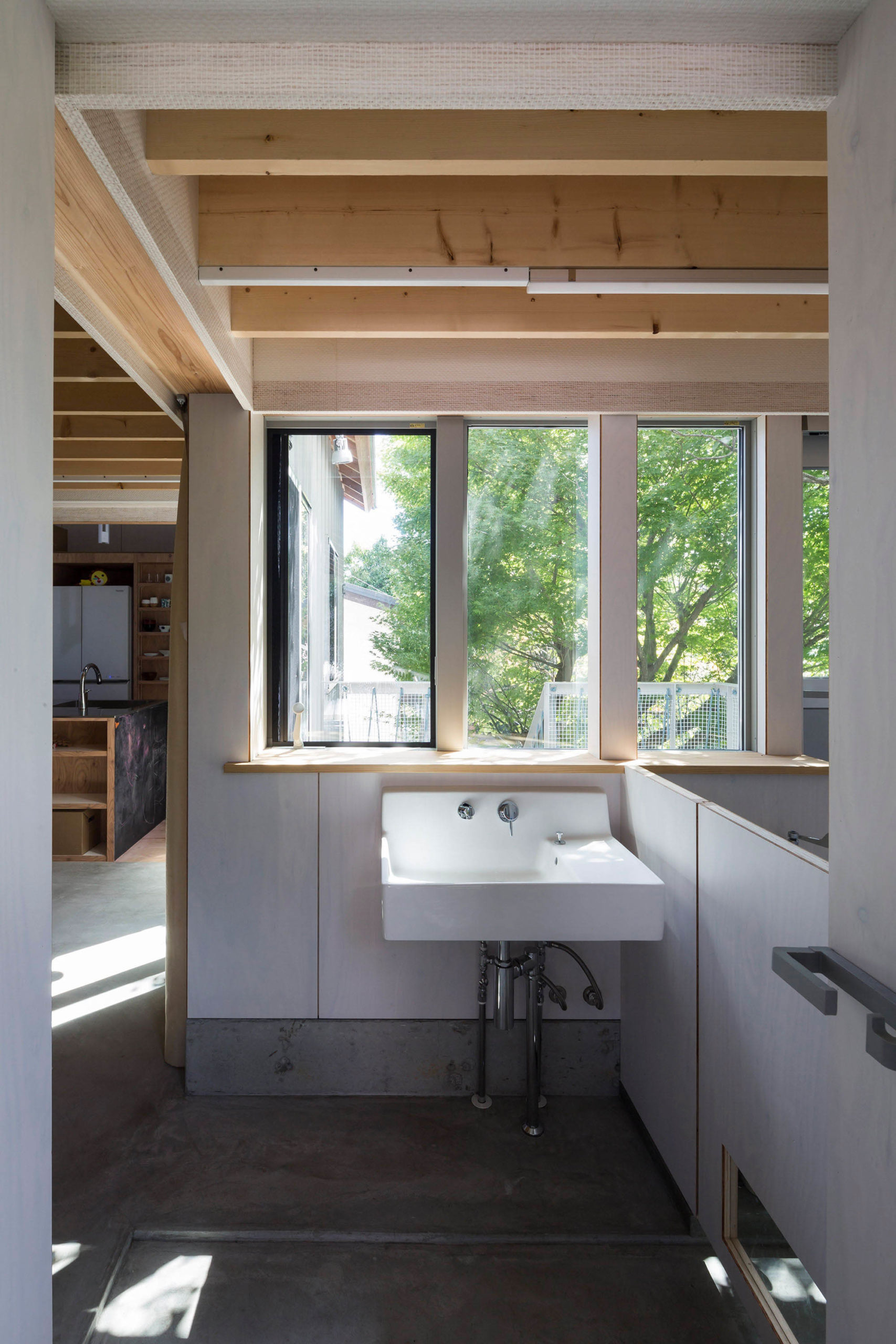 The entire sequence–– from the ramp, through the living room on the second floor towards the forest, and to the entrance; from doma (entrance hall with a dirt floor,) down the stairs to engawa (a type of veranda in traditional Japanese houses) on the first floor; from engawa to the garden under the ramp––weaves through the town, house, and forest.