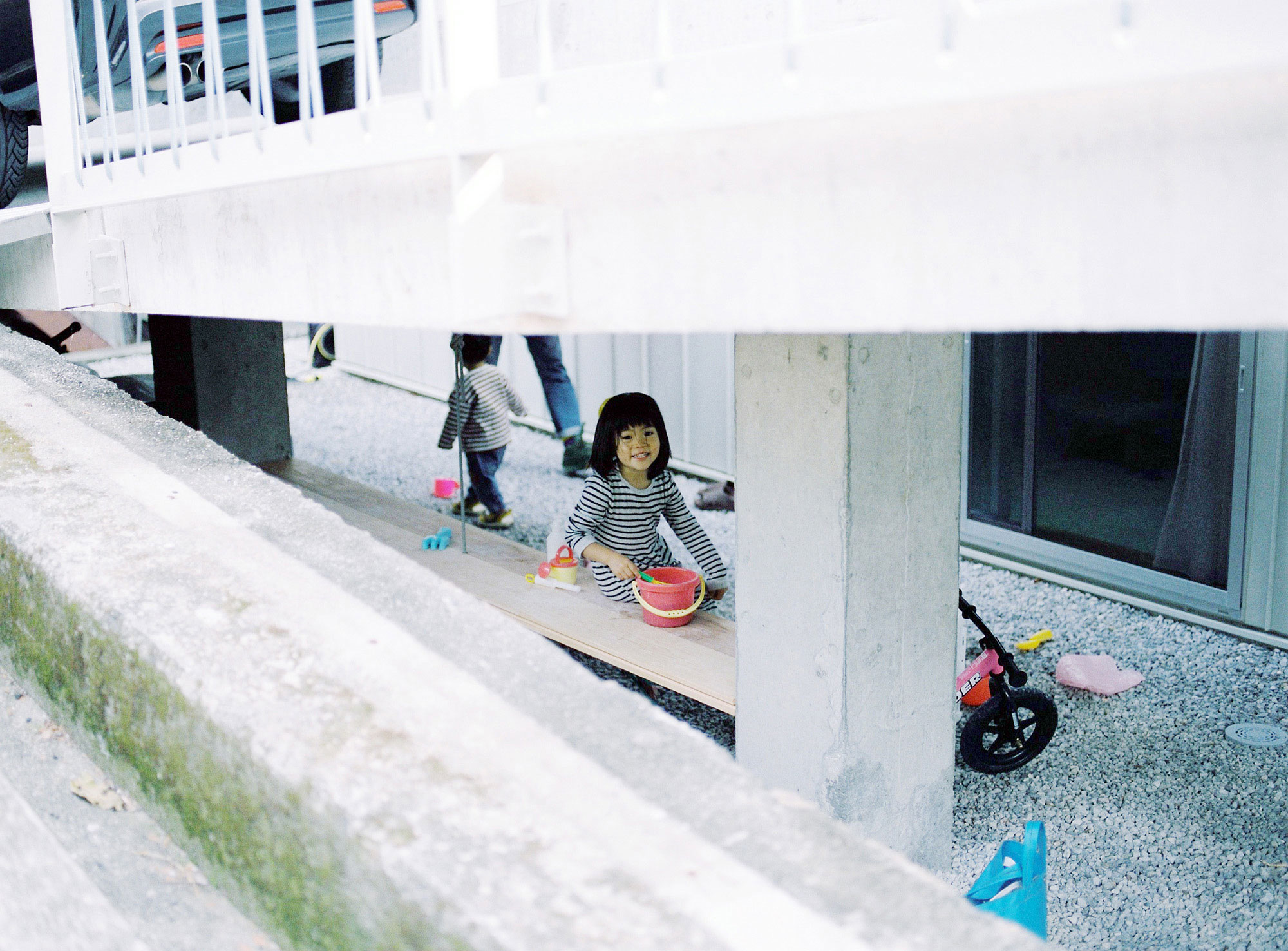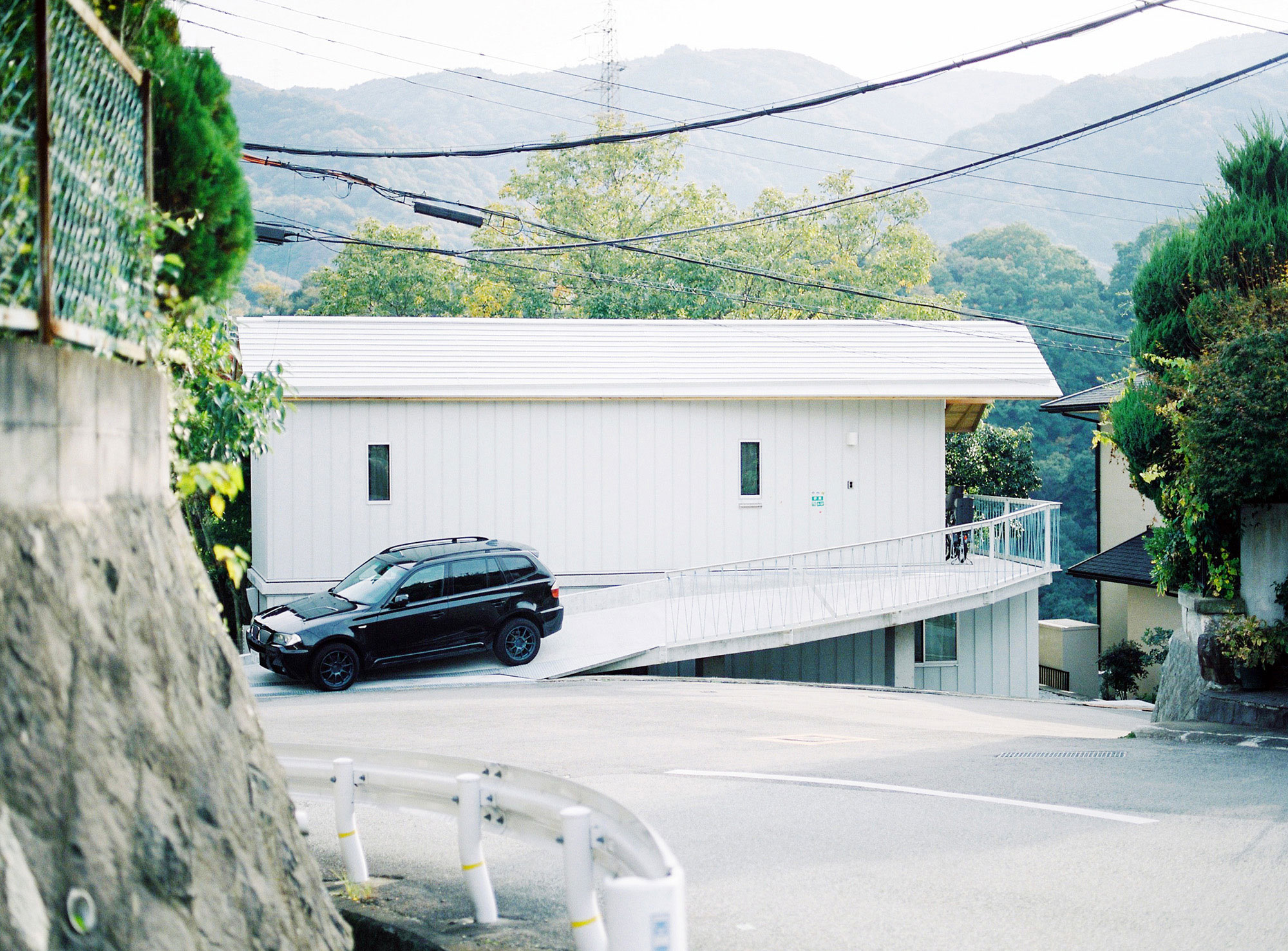 A ramp used as both an approach and parking area, which seems to branch off from the slope up the hill, is placed on the north side of the site, and a terrace is placed close to the edge of the site as if projecting into the forest. The ramp and the garden underneath on the north side represent a connection to work, school and town, while the terrace and the forest on the south side represent playful weekend activities of the family and the dog, and the building is placed in between.