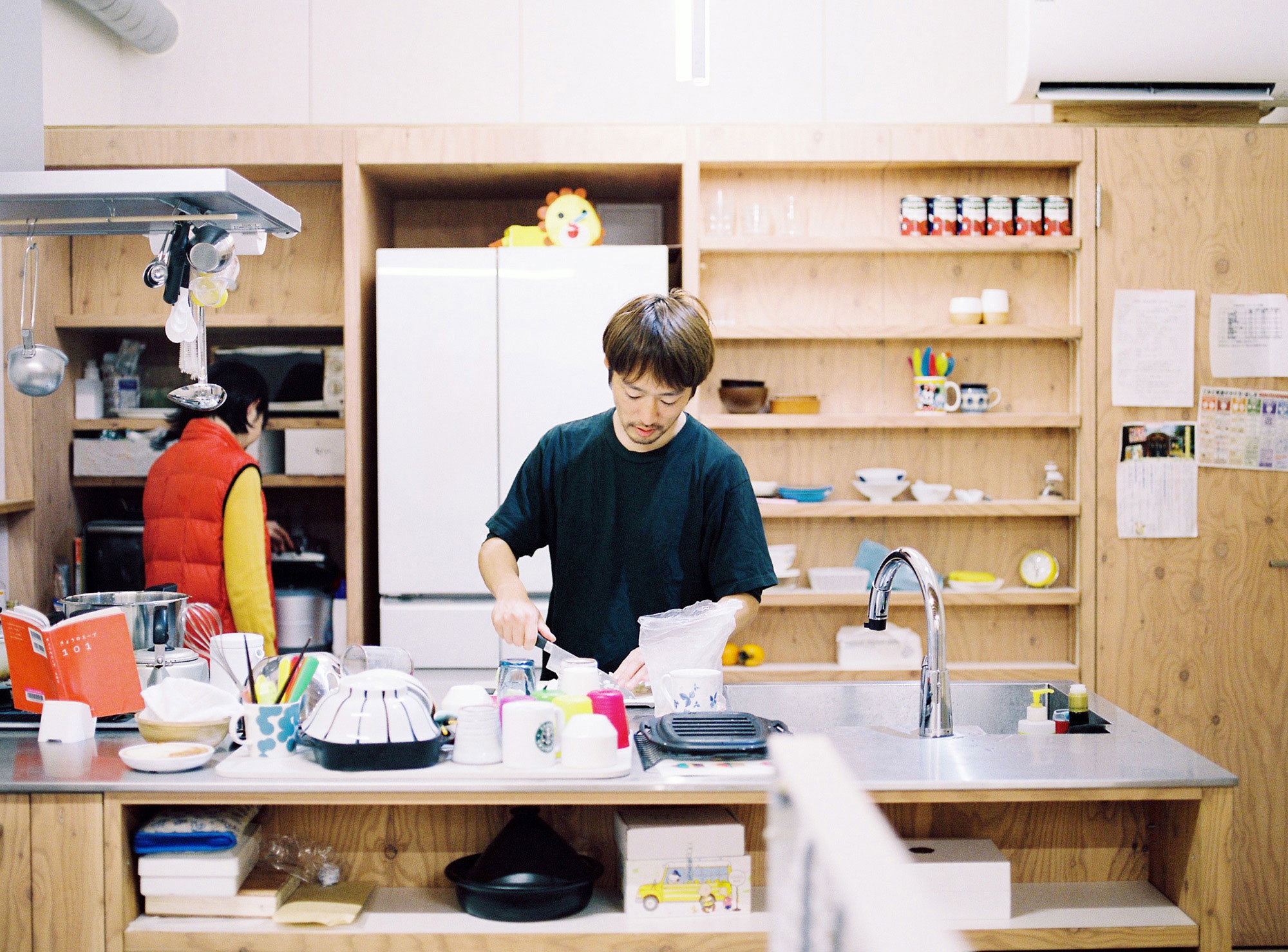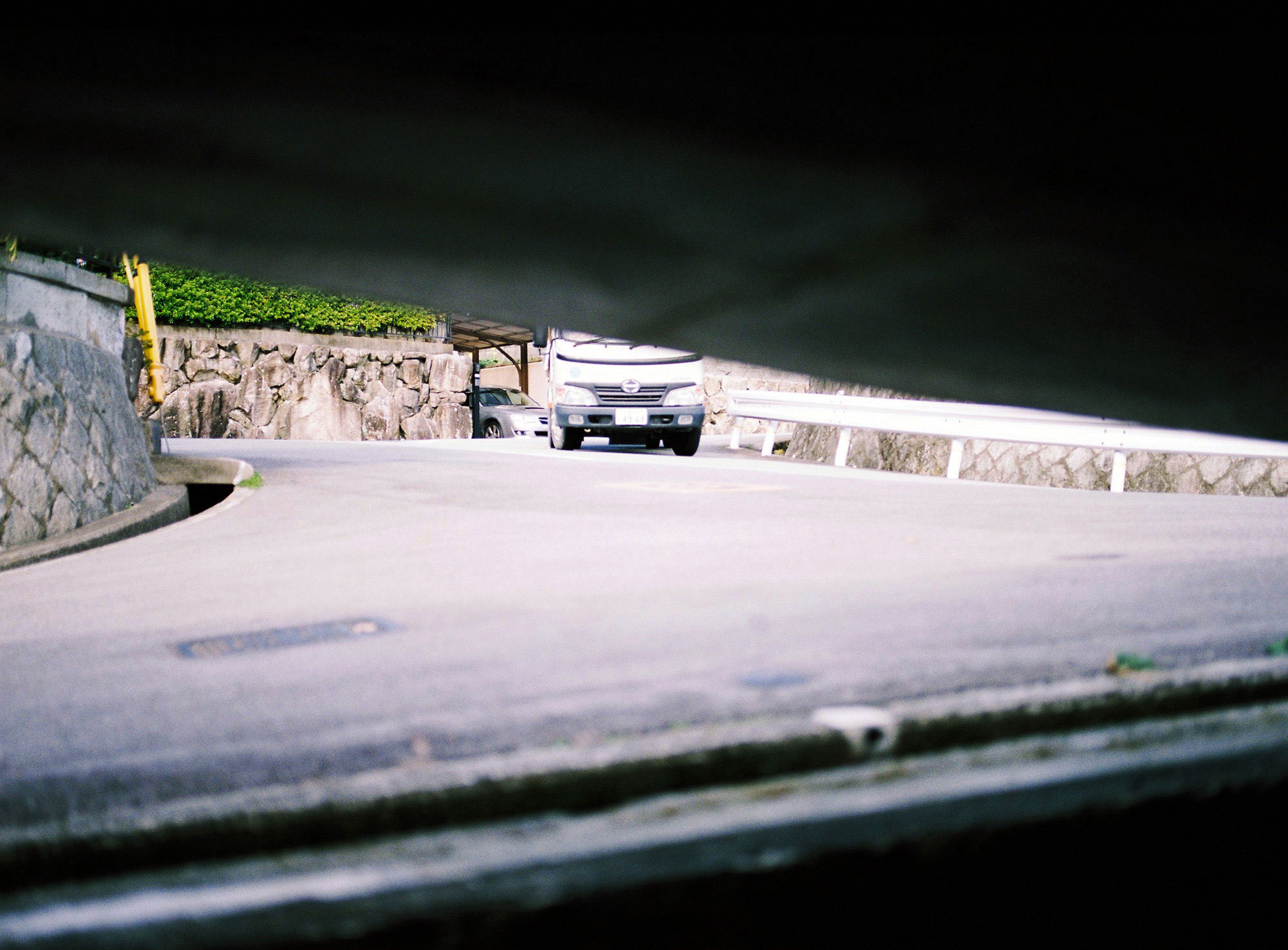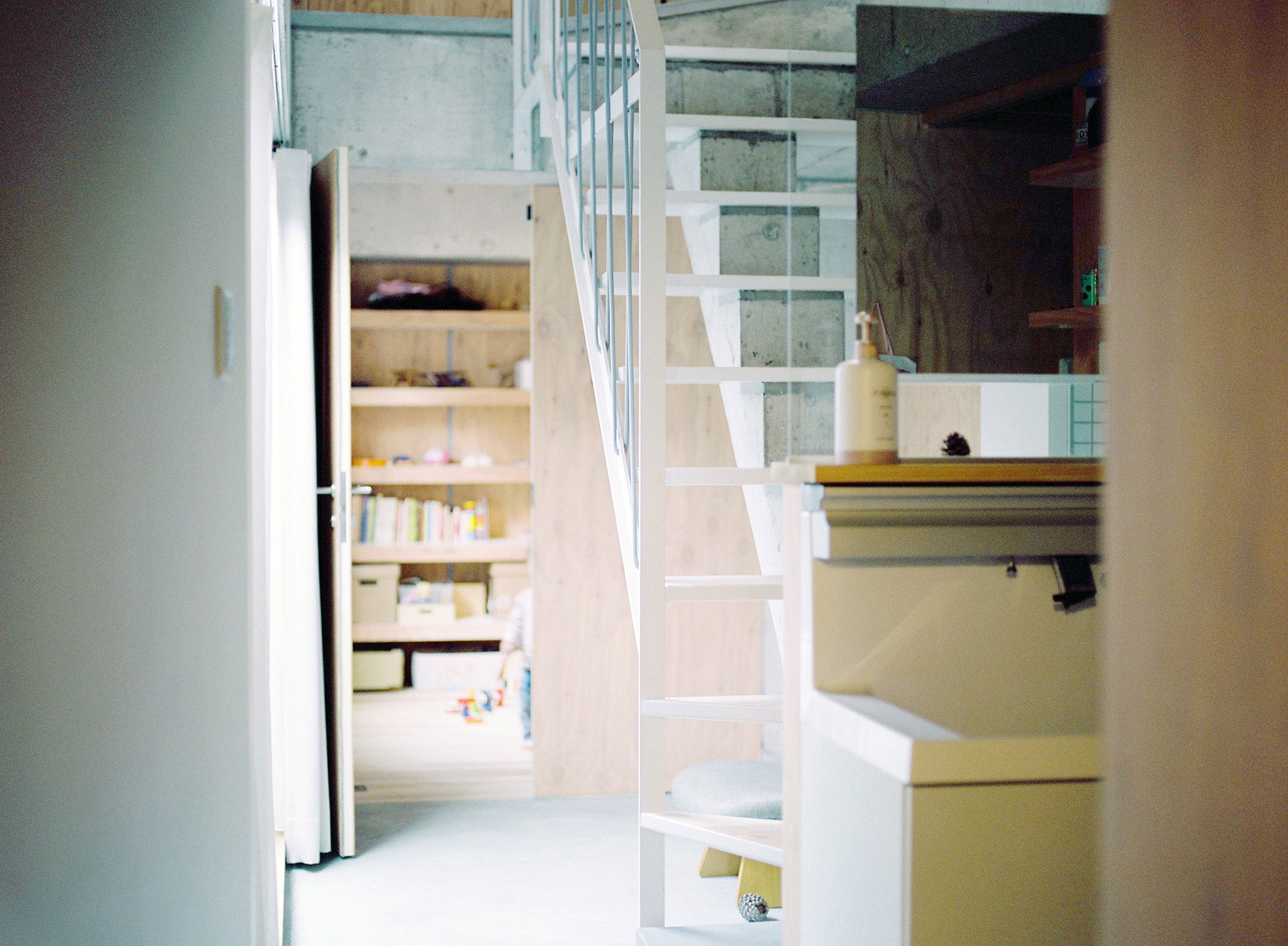 The site consists of a sloped approach way connected to the frontal road, a narrow strip of flat land stretched in the east-west direction and set at 1.2m below the frontal road, and a forest on a steep slope like a cliff on the south side. This area on hilly land was developed by a railroad company in the 1970s and is connected to the town by the only bridge that crosses the Muko River. The young family chose this place to build their new home.