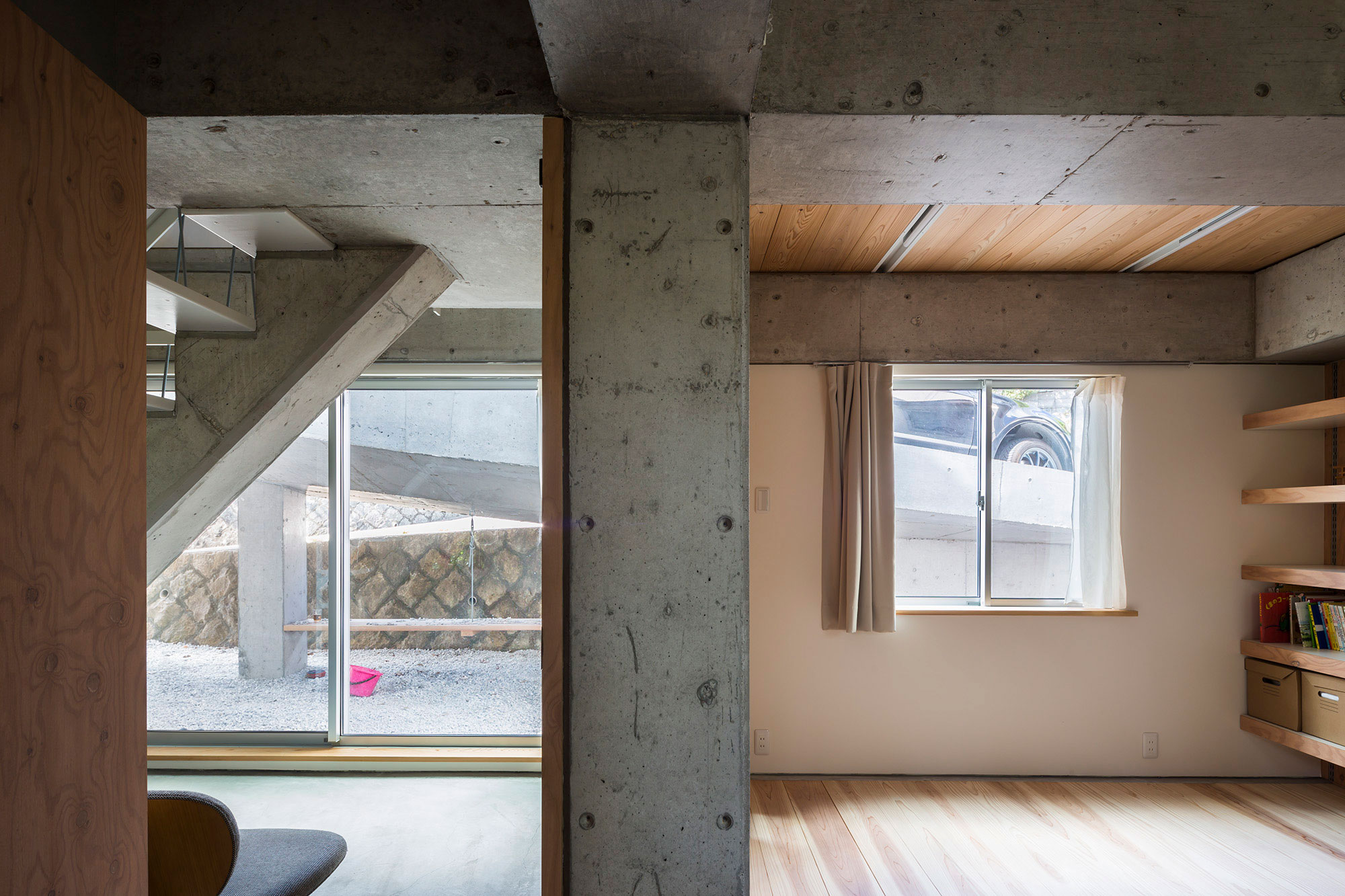 建物は1階が一本足RCラーメン構造で、2階は変形切妻の木造になっている。スロープも一本足で、スロープ下の庭に一定のリズムを作る。2階の床は39mm厚の杉無垢のフローリングでこれがそのまま1階の天井仕上げとなっている。スロープから2階のリビングを森側に迂回して玄関へ、玄関土間から階段を降りると1階の縁側へ、縁側から今度はスロープ下の庭へ、庭から再び坂へ、というシークエンスが、町と家と森を絡め取っていく。