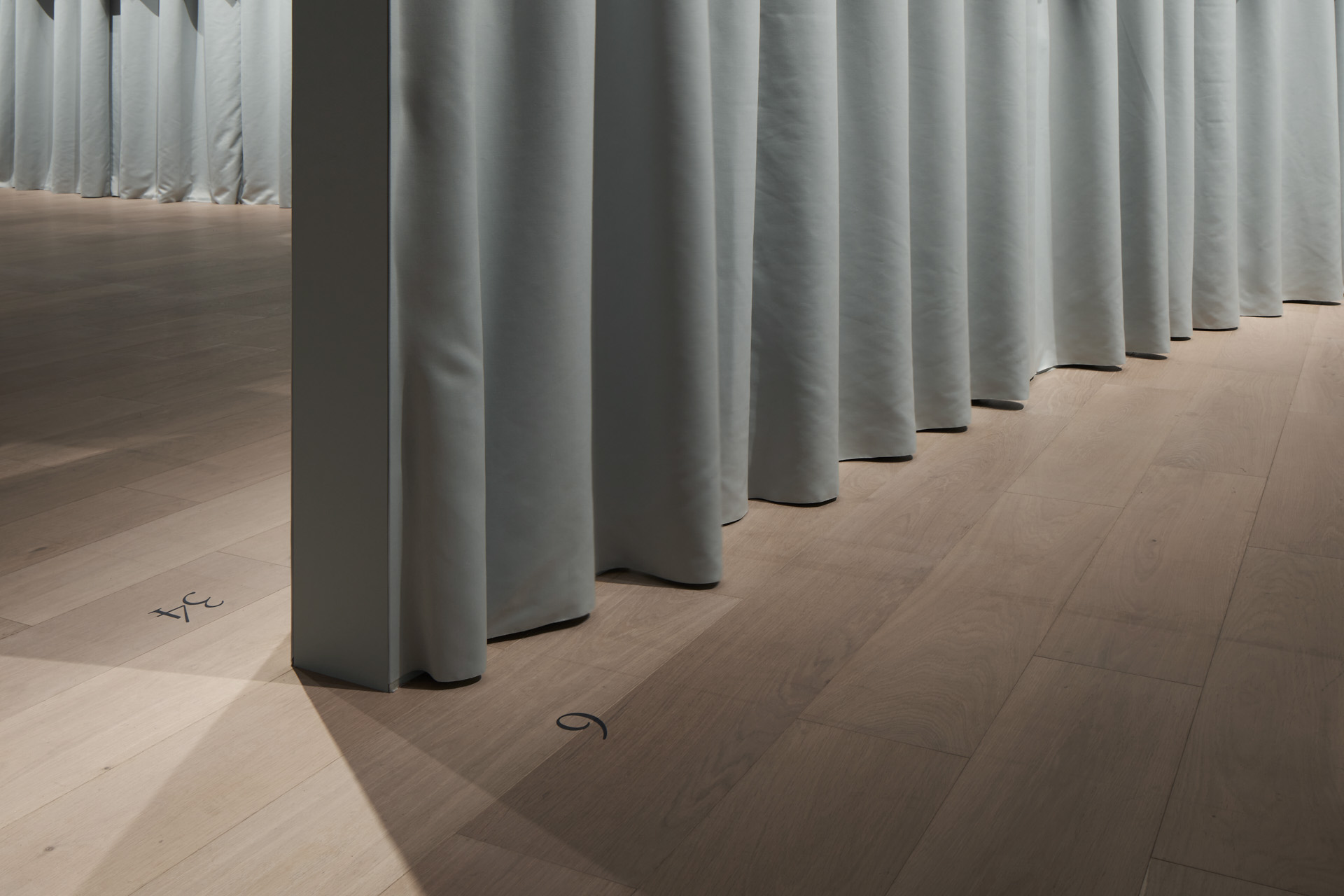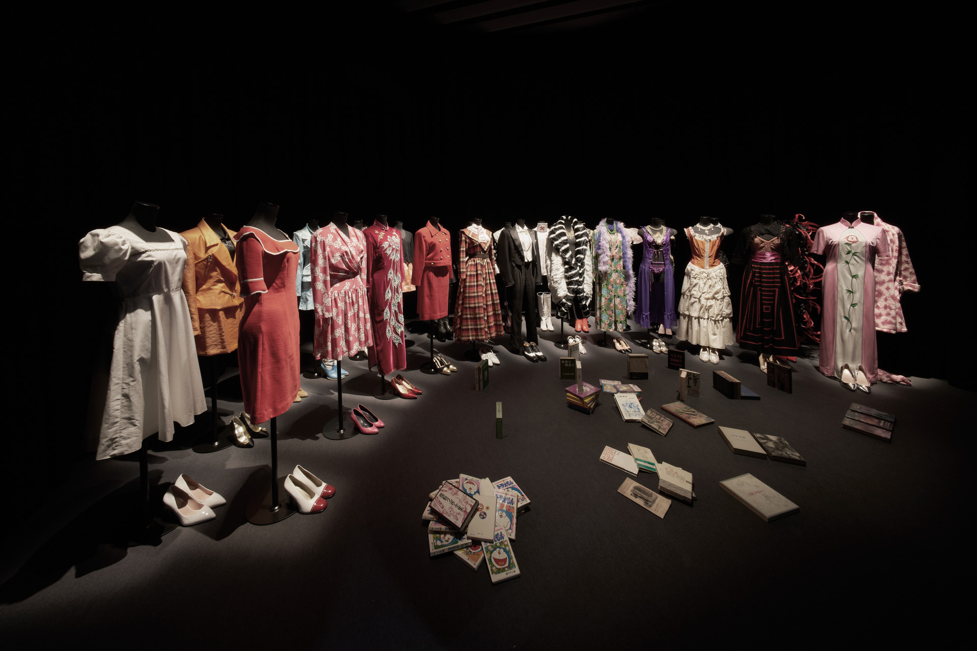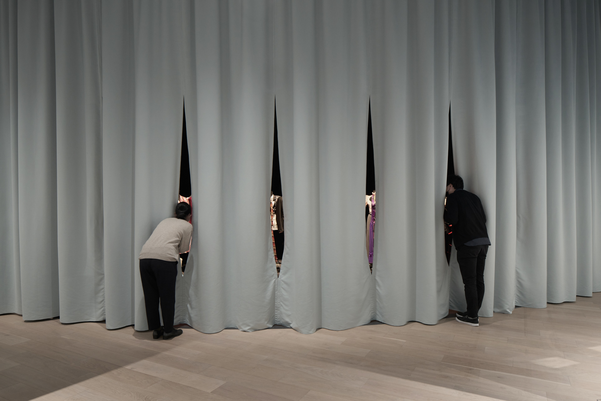 The exhibition features three rooms: the “M’s Photo Corridor,” which displays about 800 instant photos that Morimura has been taking since 1985; the “Theater of Voices,” a special acoustics space for unmanned recitations; the “Square of Dreams and Memories,” where Morimura was photographed in costume; and the “Hidden Costume Closet,” where visitors can sneak a peek into his wardrobe. In response to the artist’s request for a labyrinth-like setting, we installed framed instant photos as if floating on 5m-high curtains meandering through the M’s Photo Corridor. Visitors lose their sense of direction as they walk through the gallery and see his works. They are then gradually led farther into the exhibition room, and back into the three dark rooms.