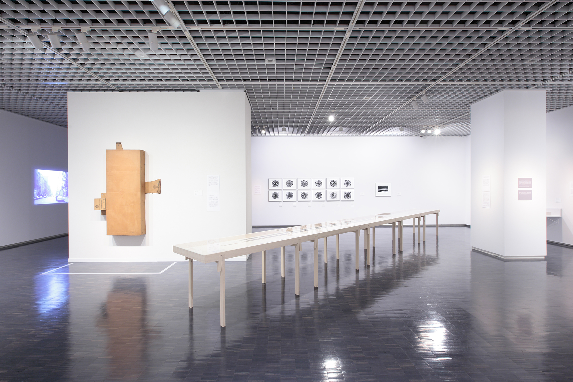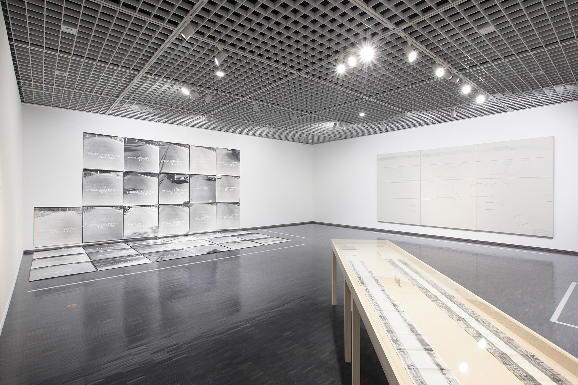 「路上」展(2011年)のための展示什器のデザイン。折りたたまれたページを展開すると、エド・ルシェー「サンセット・ストリップ沿いのすべての建物」が7.5m、木村荘八「アルバム・銀座八丁」が5.4mにもなるふたつの書籍を並べて収めるための展示ケースで、かつ、今後も使用できるように組み立て・分解ができるものを、というのが設計条件であった。1台ごとに組み立てられる長さ1650mmのシナベニヤ製のテーブルを5台連結させ、アクリル板をのせて8mの展示ケースとなる。各テーブルは24mmのシナベニヤを切り出したパーツからできており、天板に開けたほぞ穴に脚を差し込んで側板と組み合わせるとテーブル上面にはベニヤの断面が現れる。最後に楔を打ち込むと天板と脚と側板が固定される。